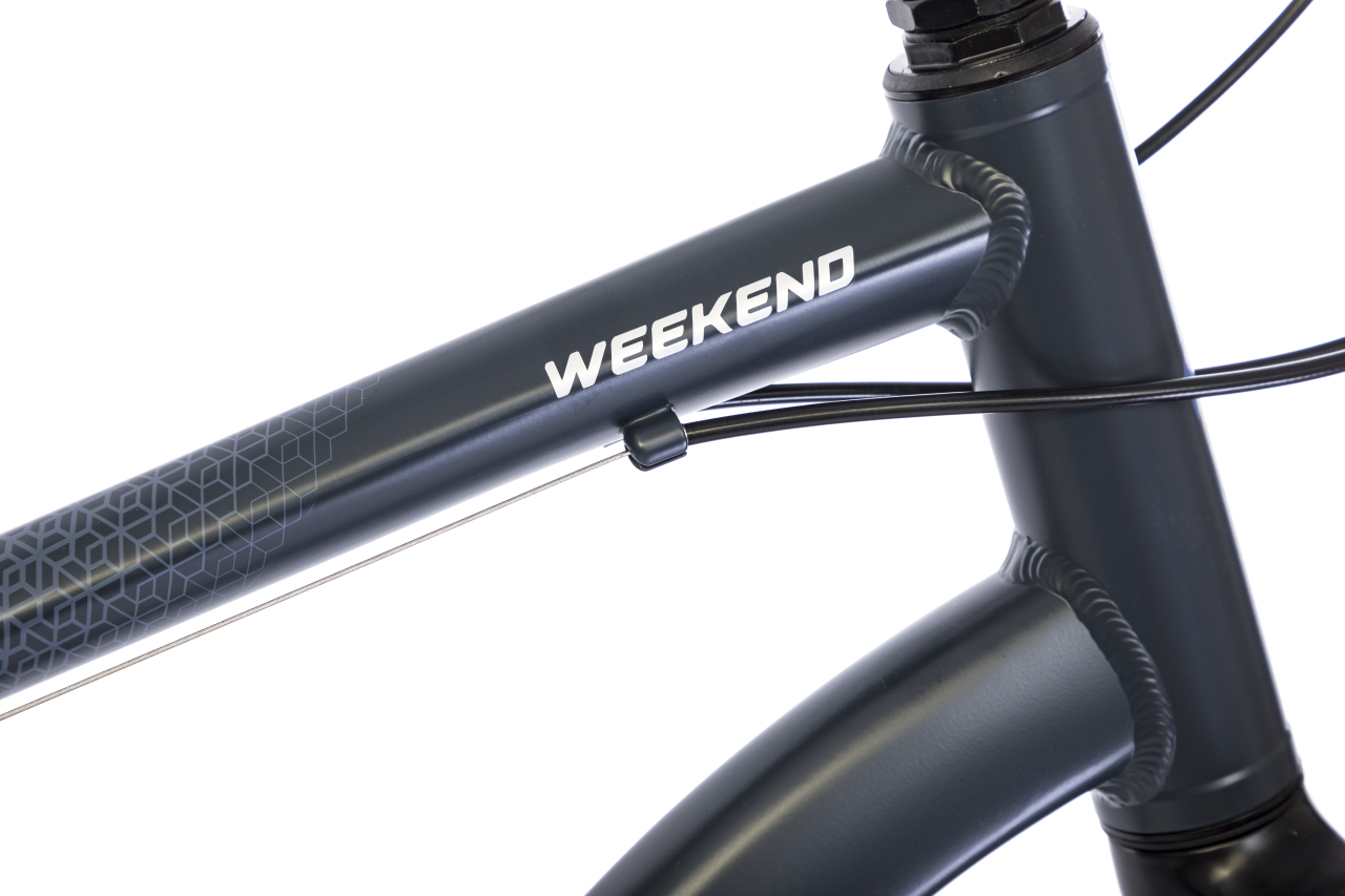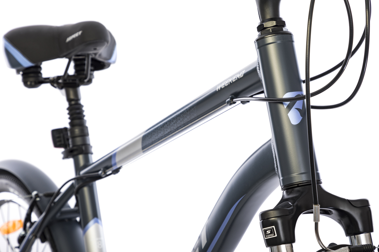 Модель Weekend создана для спокойного, прогулочного катания. Если Вы не ставите перед собой спортивных целей, а предпочитаете неспешную прогулку по парку, это именно то, что Вам нужно. Конструкция велосипеда рассчитана на свободную, не спортивную посадку. Руль регулируется по высоте, а также по удаленности от седла, что позволяет идеально подстроить велосипед под свой рост. Удобное широкое седло установлено на подпружиненный подседельный штырь, что даёт высокий уровень комфорта при езде по сложным дорогам. Комфортному преодолению разбитых участков дорог также способствует амортизационная вилка. В комплект входят полноценные крылья, отлично защищающие от грязи и брызг.