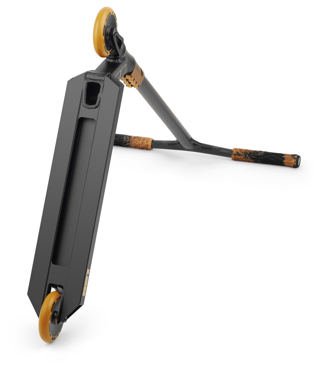 Легкость самоката кроется в деке и технических решениях в ней. Производитель оставил форму доски неизменной, при этом увеличив ее длину, и расширив эффективное пространство, что дает необходимый контроль при скольжениях и трюках с вращениями. Сама дека выполнена из алюминия, сплава 7005 Т6, легкого и прочного материала. Стоит заметить, что в данной модели профиль деки не идеально плоский, а имеет небольшие изгибы по бокам, что действительно важно в стрит-катании. Руль и вилка самоката выполнены из алюминия. Данное решение значительно уменьшает общий вес самоката без ущерба прочности.